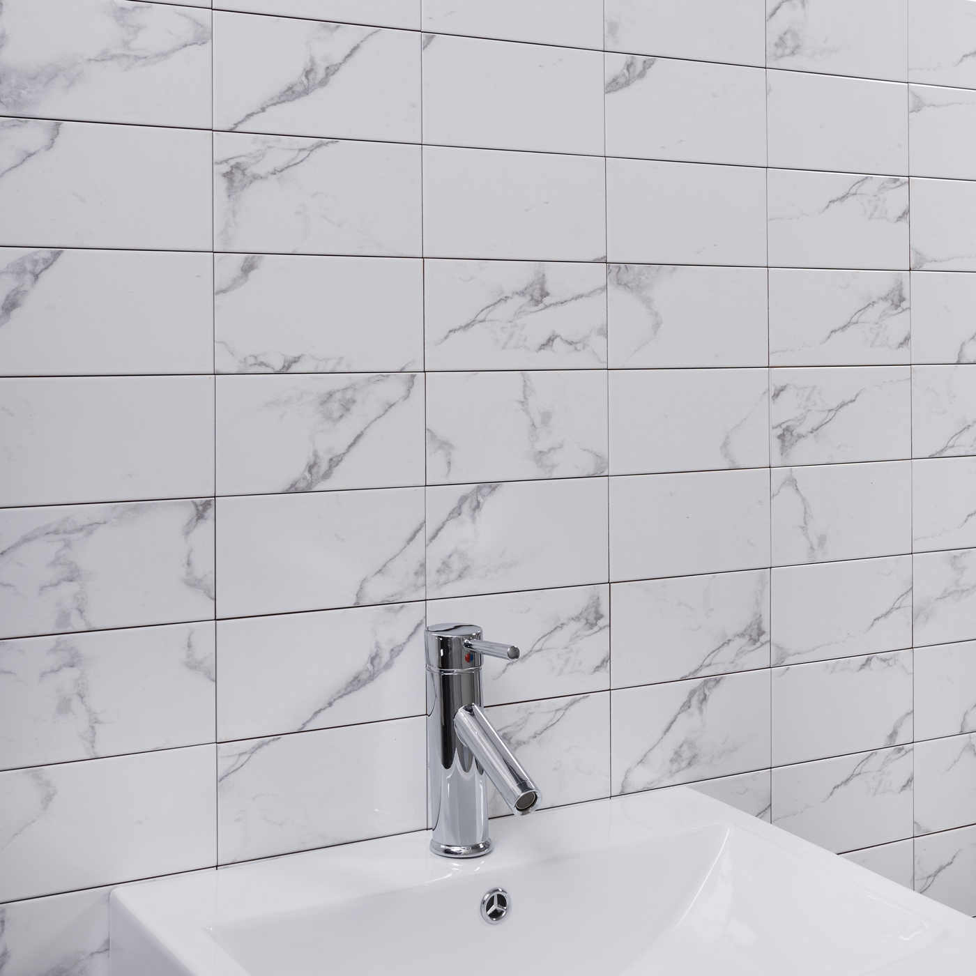 Kakel Carrara 10x20 är ett klassiskt kakel med blank, slät yta och marmor-känsla. Ger en exklusiv och vacker vägg.