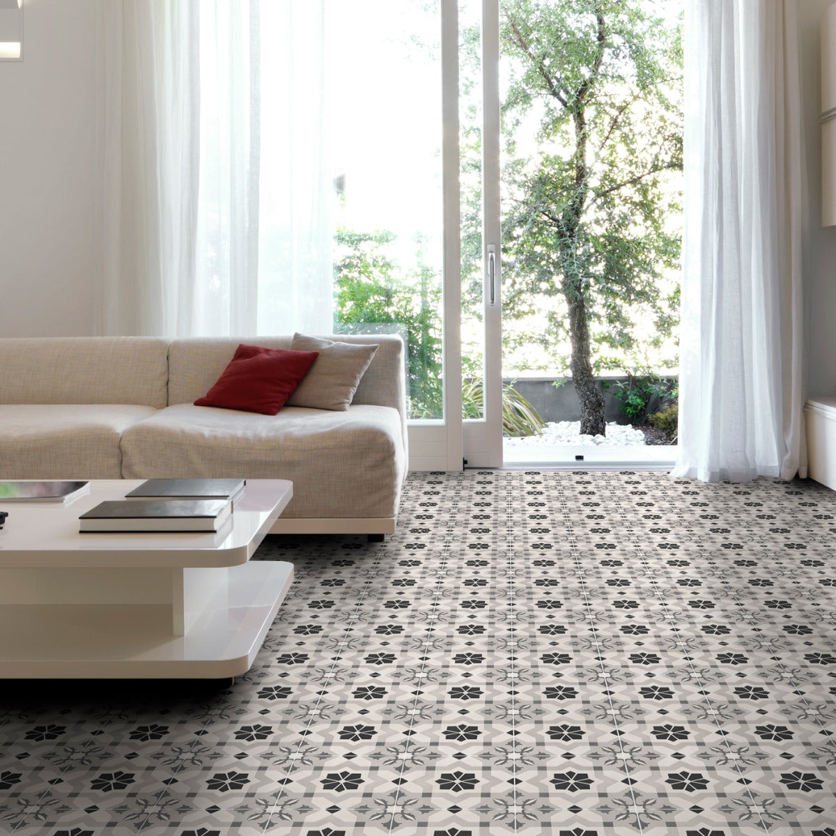 Varje platta mäter 45x45 cm och är ”pre-cut” i fyra delar som fogas samtidigt som man fogar mellan plattorna, vilket ger intrycket av mindre klinker (22,5x22,5 cm) när de väl lagts. Ytan är matt, och med hög halksäkerhet, men samtidigt smutsavvisande och lätt att hålla ren. Ett utmärkt val i kök, badrum eller andra områden där man bör tänka på halkrisken.
