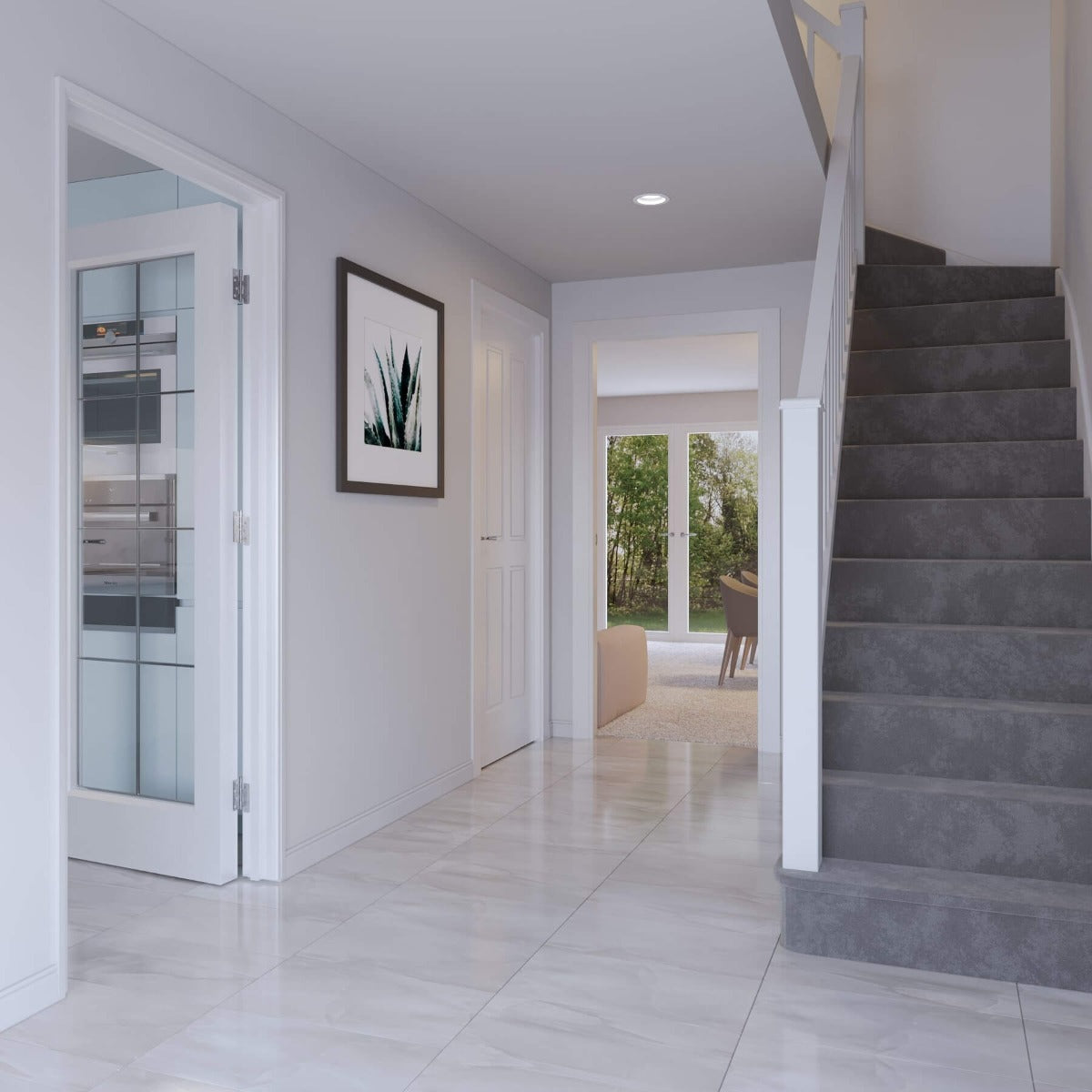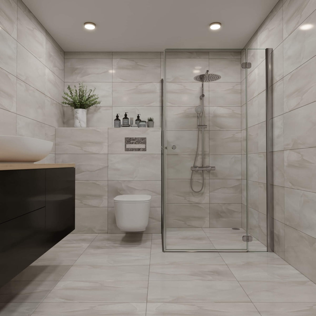 De subtila, men ändå distinkta marmoreringarna skapar en visuell dynamik som ger en känsla av lyx och stil. Den blanka ytan reflekterar ljuset på ett sätt som förstärker rymdkänslan och skapar en elegant atmosfär.