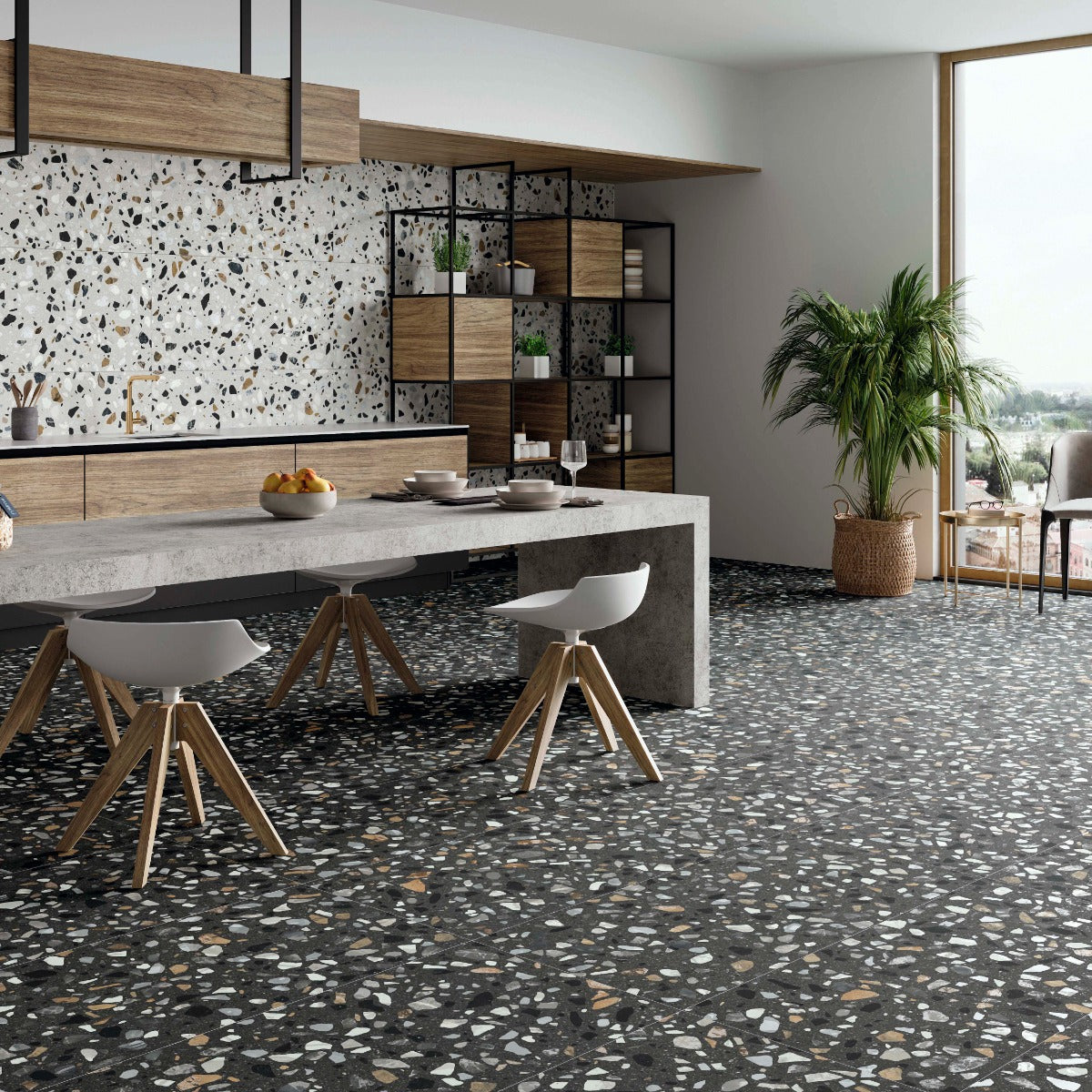 Klinker Terrazzo XL kombinerar den tidlösa skönheten hos terrazzo med moderna material och designelement. Denna granitkeramik med matt yta och rektifierade kanter ger ditt utrymme en sofistikerad och stilren känsla samtidigt som den erbjuder en mängd fördelar och mångsidiga användningsområden.