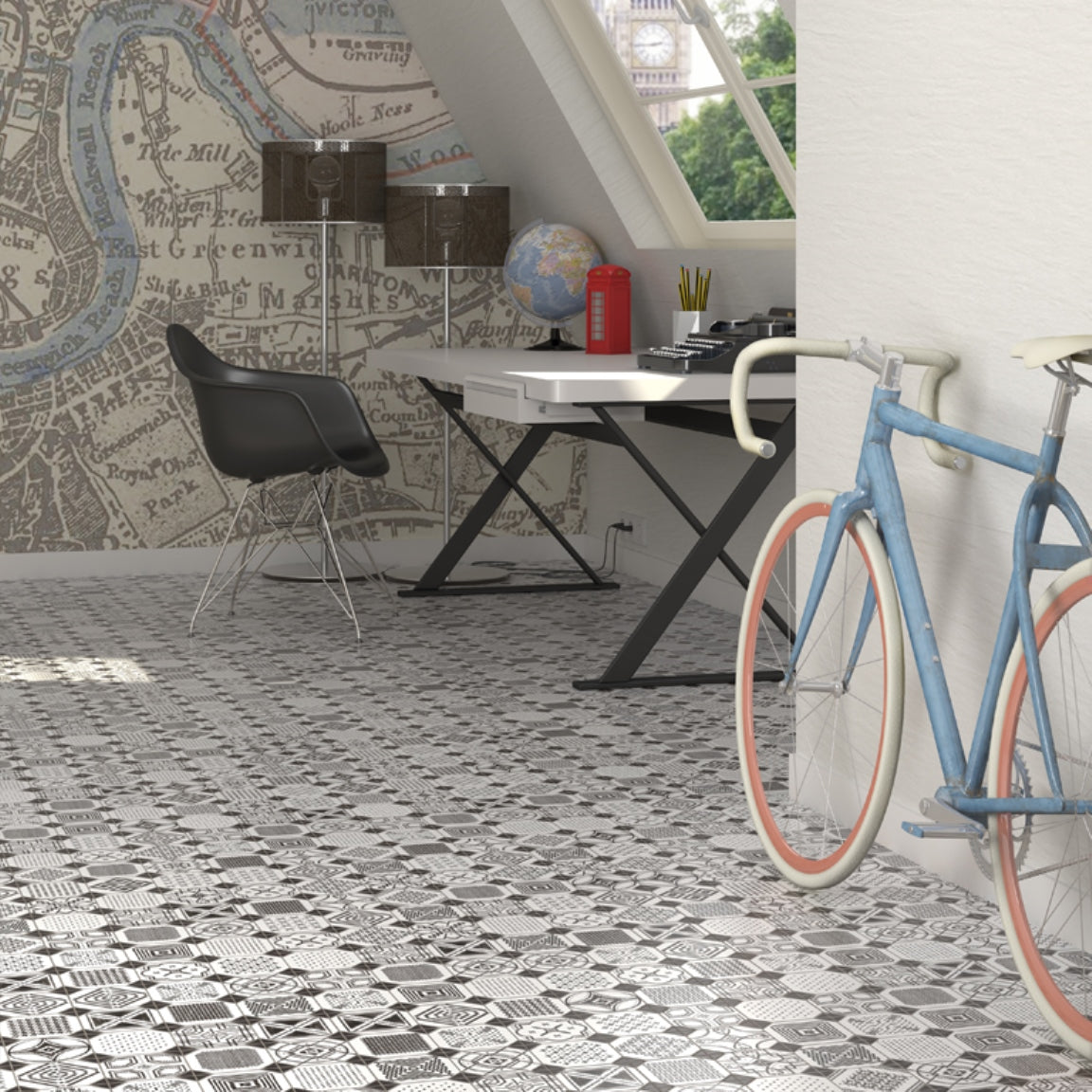 Klinker Vondel 31,6x31,6 är en mönstrad klinker i svart och vitt. Varje klinker är indelad i mindre rutor, alla med olika mönster. Vackert mönstrade plattor med både modern och klassisk känsla.