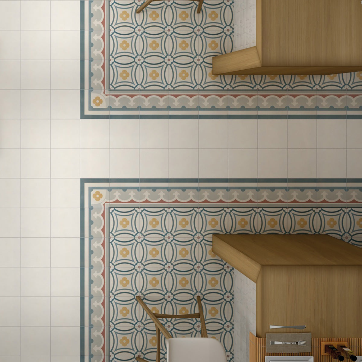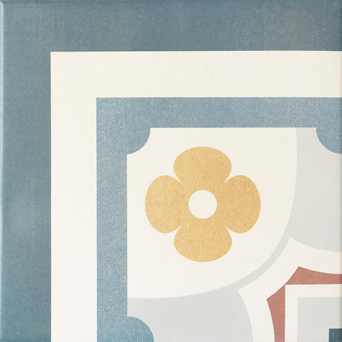 Inspirerad av sekelskiftets klassiska mönster förmedlar hörnplattan en känsla av tradition och elegans. I kombination med dekor- och kantplattorna får du en tidlös design som passar lika bra i moderna hem som i traditionella miljöer.