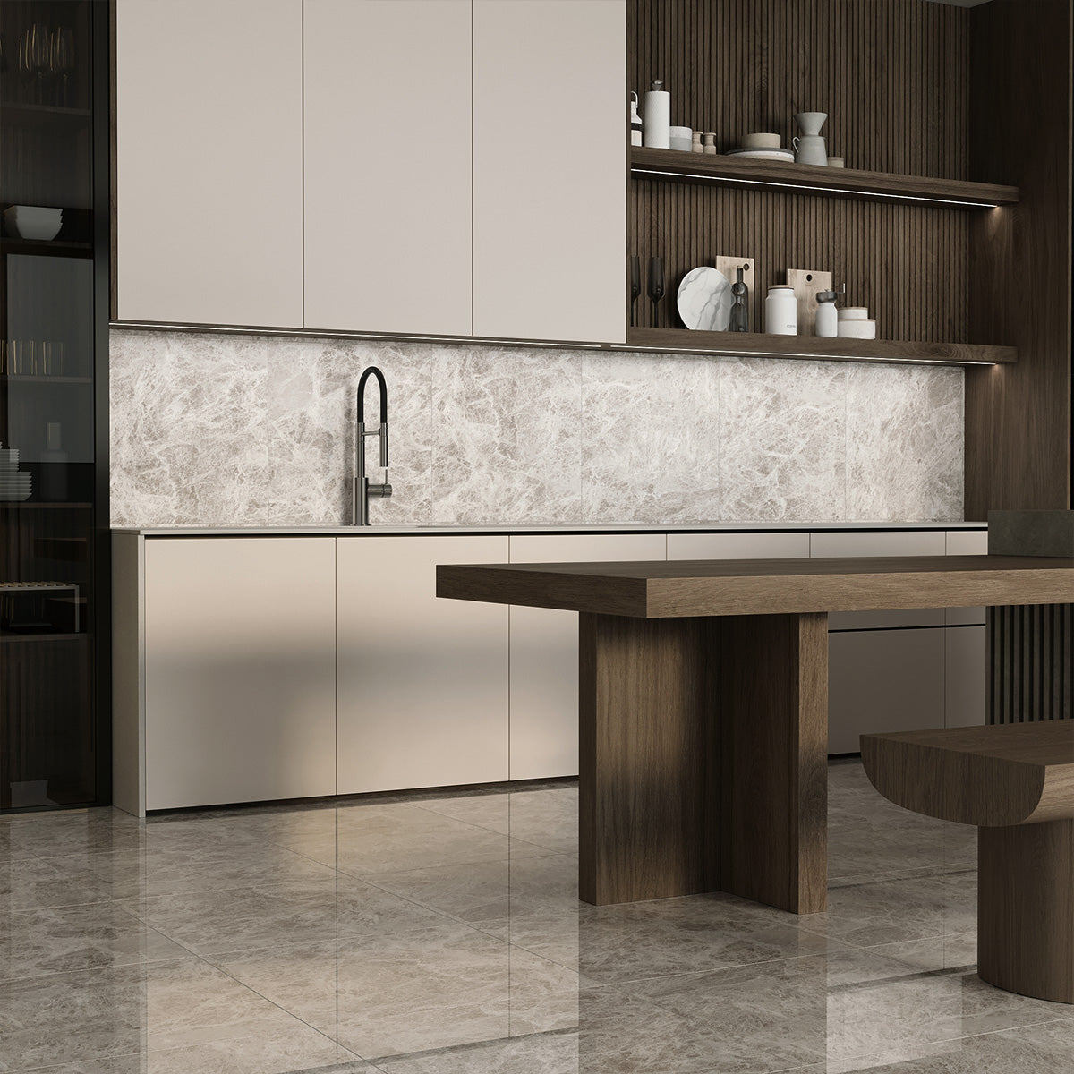 Klinker Emperador Light Grey Marmor Blank är en imponerande granitkeramik som efterliknar den prestigefyllda Emperador-marmorn. Med sina imponerande dimensioner på 60x60 cm, en polerad blank yta och rektifierade kanter, utstrålar denna marmorliknande keramik en tidlös elegans och lyxig atmosfär. De rektifierade kanterna möjliggör installation med smala fogar, så smala som 1 mm. Resultatet blir en jämn och stilren yta som ger ett modernt uttryck.