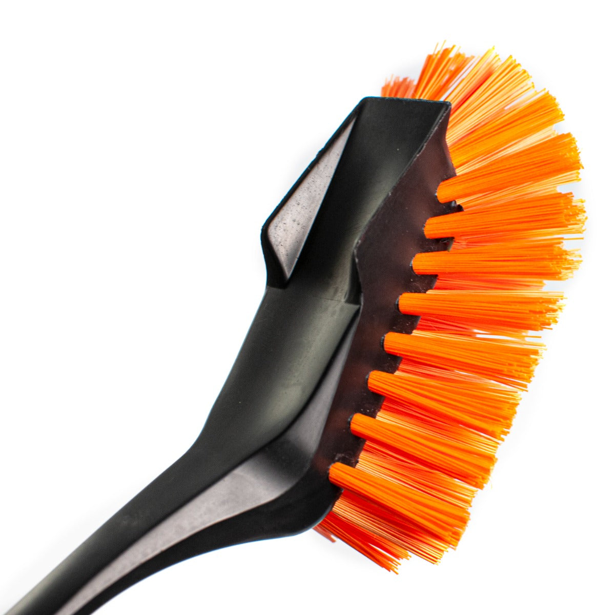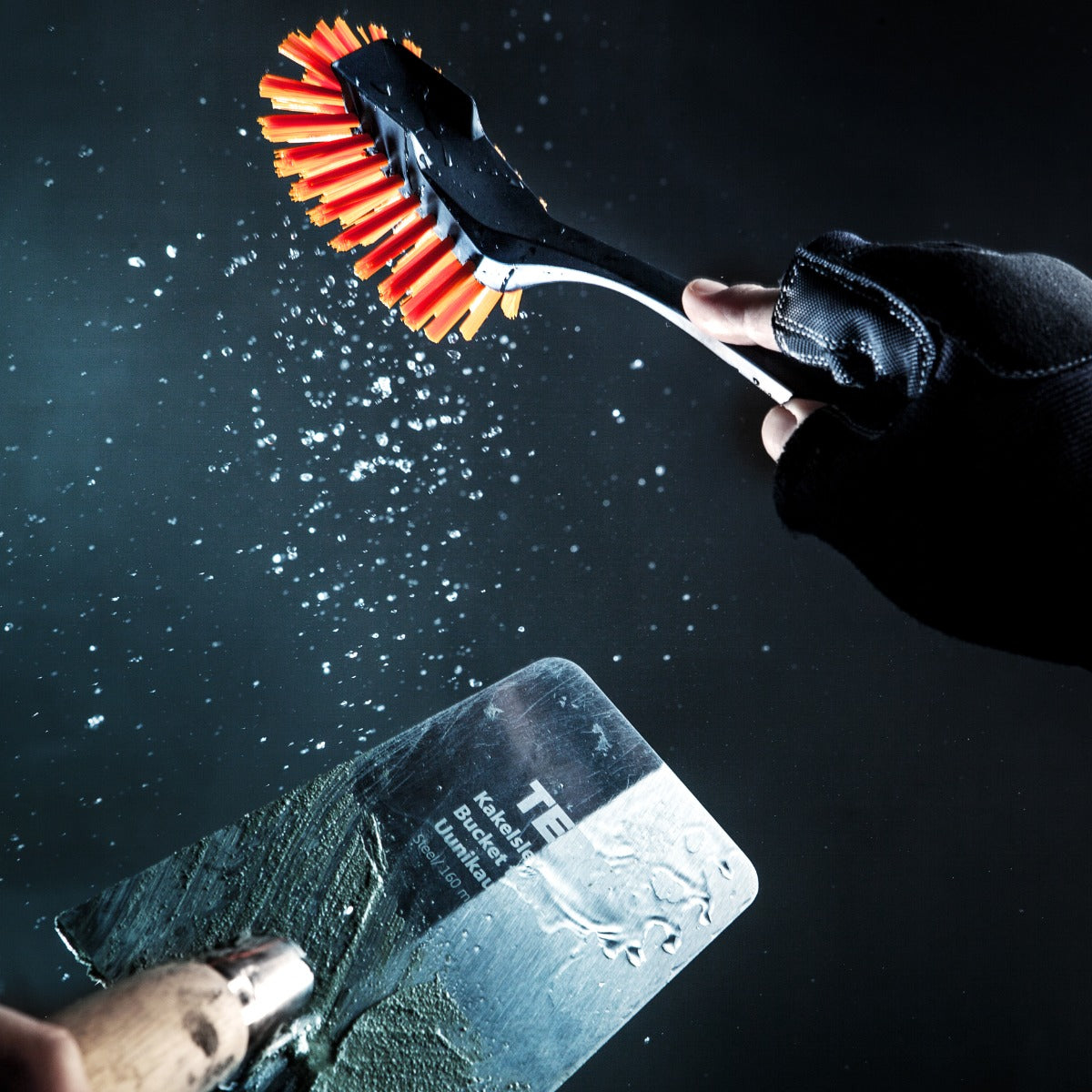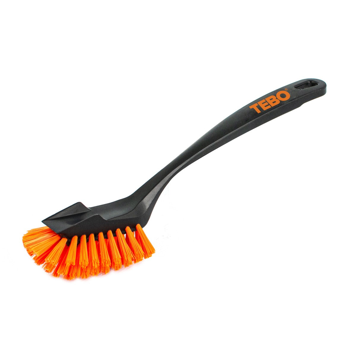 Svart plastrygg med kraftig skrapkant och orange styv borst av nylon. För rengöring av t.ex. verktyg och hinkar.