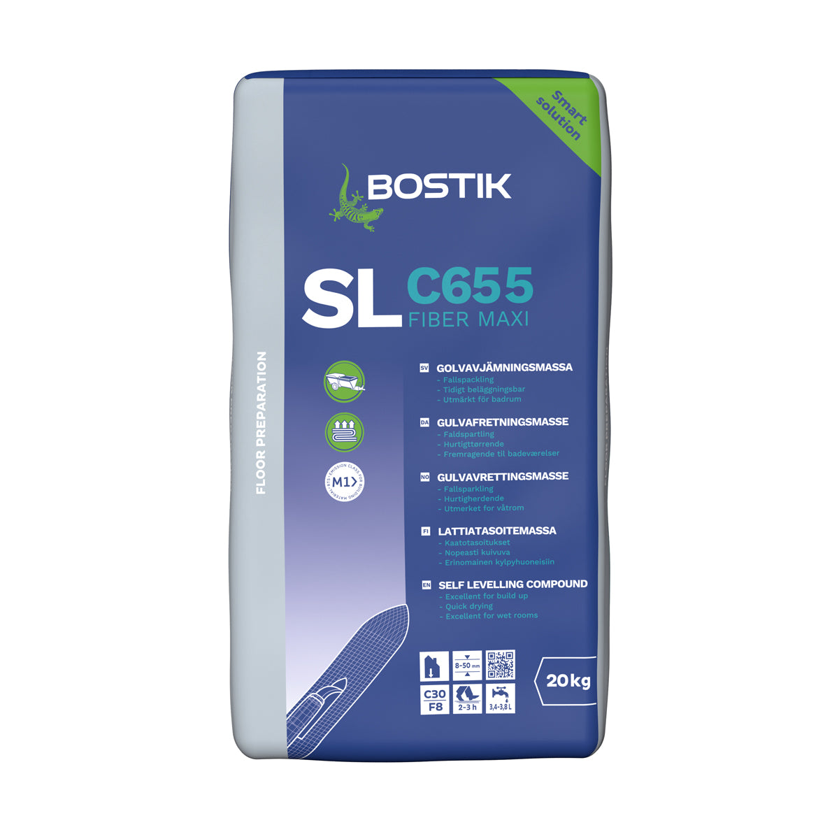 Flytspackel Bostik SL C655 Fiber Maxi är fiberförstärkt golvspackel som är speciellt optimerat för fallspackling i badrum. SL C655 Fiber Maxi passar även bra för inspackling av el- och vattenburen golvvärme. Produkten är lågemitterande (M1) och EPD-verifierad.