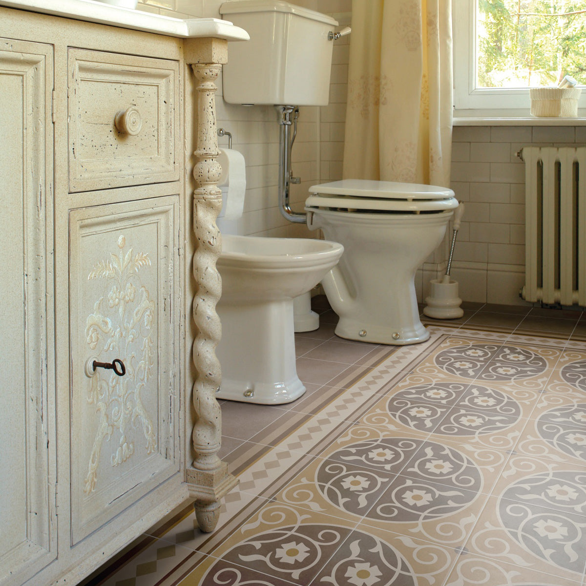 Genom att kombinera kantplattan med dekor- och hörnplattorna ur samma serie kan du skapa en helhet som påminner om traditionella cementplattor, men med granitkeramikens slitstyrka och enkelhet. Perfekt för att lyfta golv i hall, kök, badrum eller entréer där du vill ha en tydlig inramning och ett genuint klassiskt uttryck.