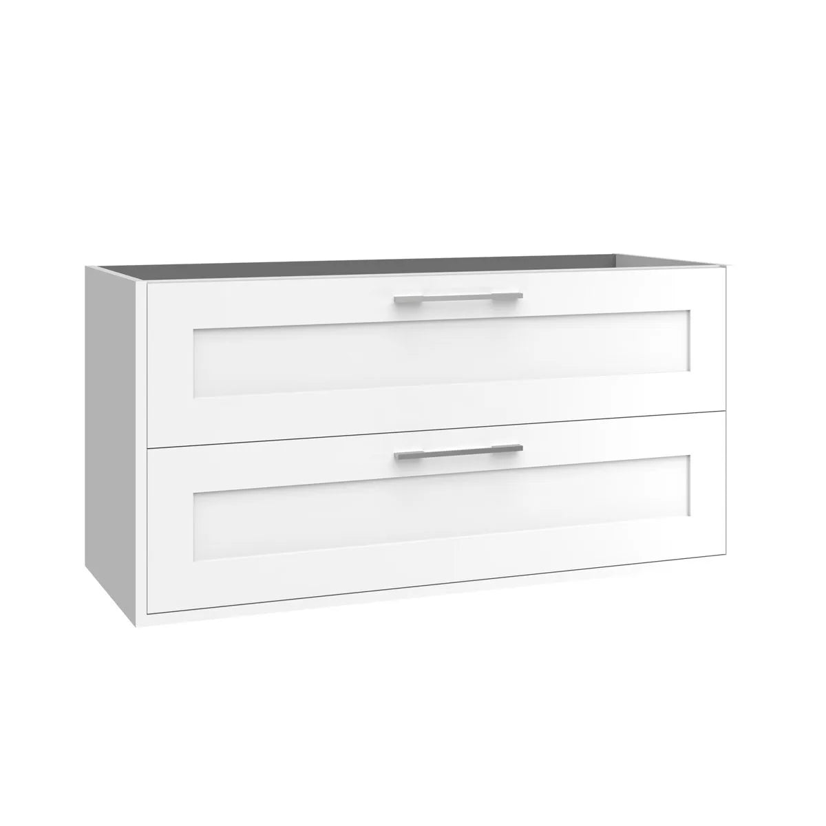 Kommoderna finns i bredd 60, 80, 100 och 120 cm, med ett djup på 45 cm och höjd på 55 cm – perfekt anpassade för såväl små som större badrum. Tillverkade av laminerad 19 mm MDF i både fronter och sidopaneler, med ramprofil i tydlig allmogestil.