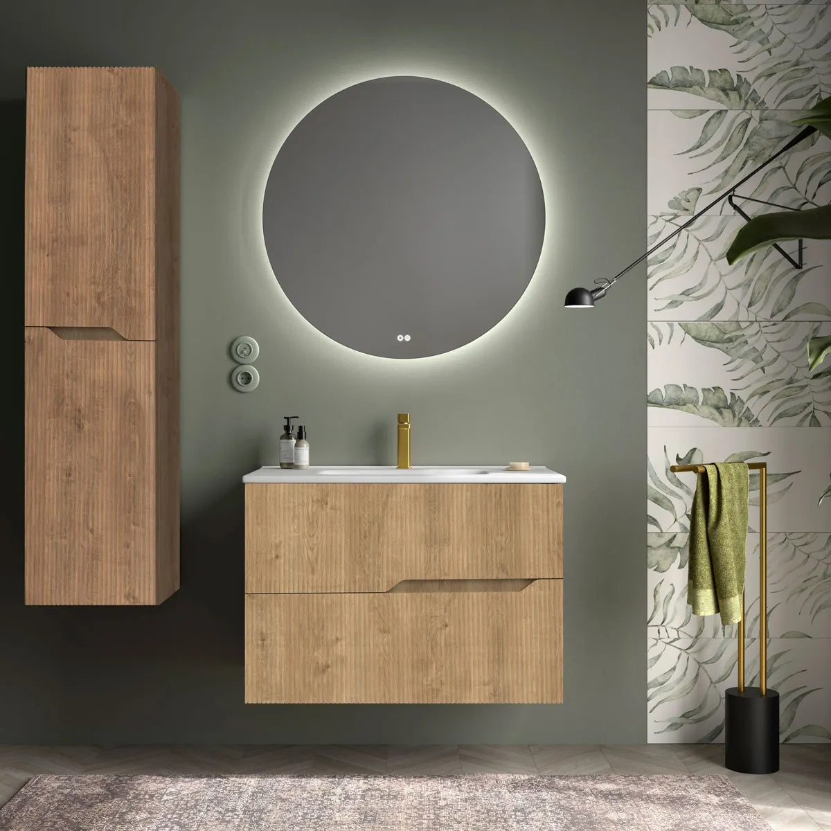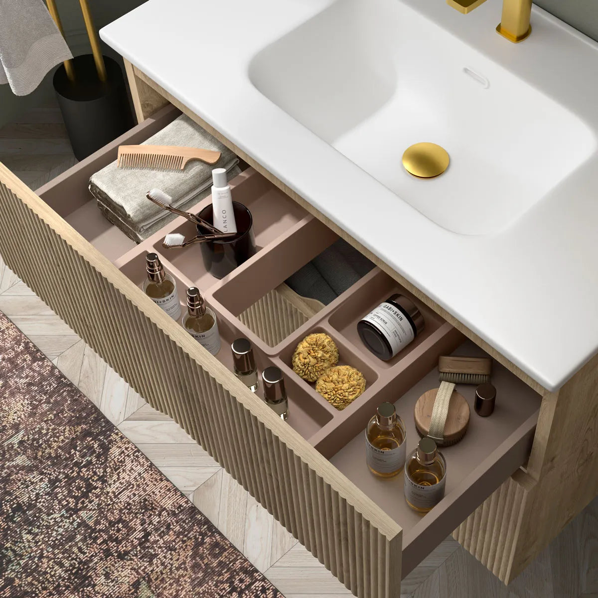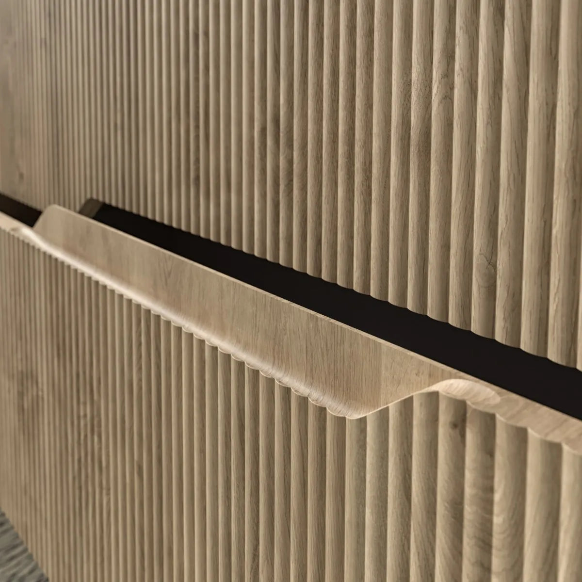 Tenfors Bambu är en badrumskommod som kombinerar sofistikerad design med praktiska funktioner, och är skapad för att bli ett blickfång i varje badrum. Med sin unika textur på lådfronterna, skapar den ett modernt och naturligt utseende som samtidigt är varmt och inbjudande. Texturen på lådfronterna är både estetiskt tilltalande och praktiskt funktionell, vilket gör möbeln till en perfekt balans mellan stil och användbarhet.