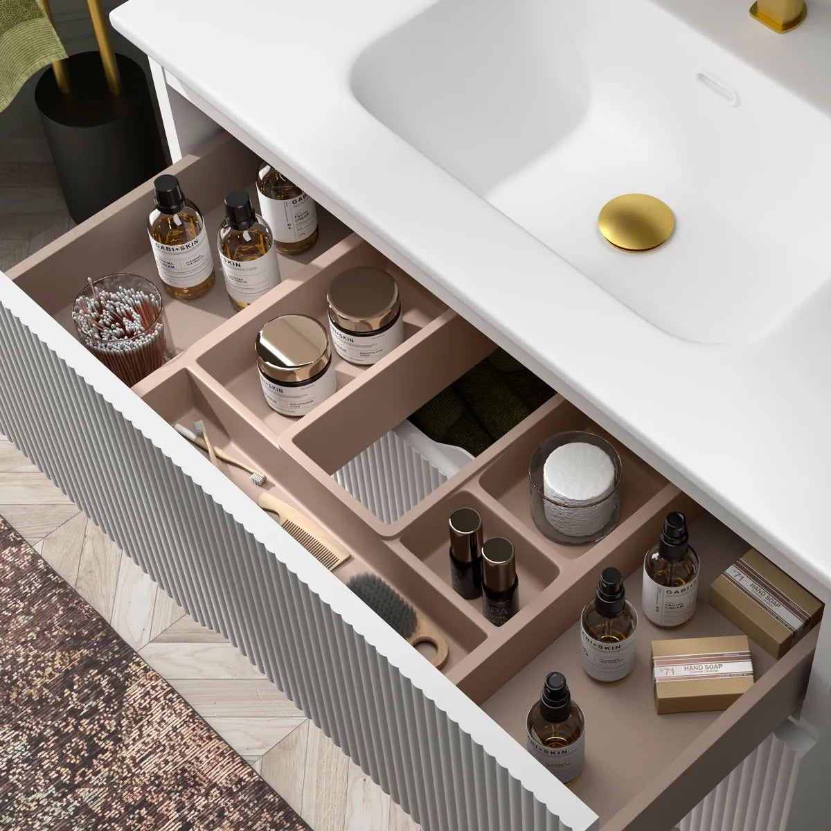 En av de mest framträdande designdetaljerna hos Tenfors Bambu är den smart utformade greppkanten på lådorna. Greppkanten är diskret inbäddad i lådfrontens struktur, vilket ger en strömlinjeformad och stilren design samtidigt som den är lätt att greppa och använda. Detta är en genomtänkt detalj som inte bara ser bra ut utan även förenklar användningen av lådorna.