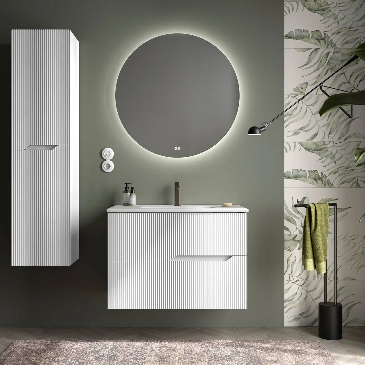 Tenfors Bambu är en badrumskommod som kombinerar sofistikerad design med praktiska funktioner, och är skapad för att bli ett blickfång i varje badrum. Med sin unika textur på lådfronterna, skapar den ett modernt och naturligt utseende som samtidigt är varmt och inbjudande. Texturen på lådfronterna är både estetiskt tilltalande och praktiskt funktionell, vilket gör möbeln till en perfekt balans mellan stil och användbarhet.