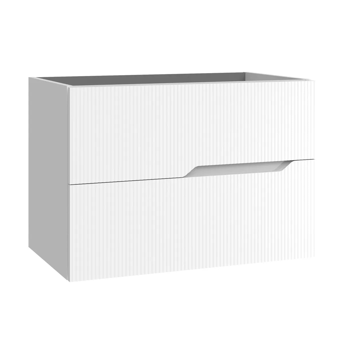 För att ge en svävande och minimalistisk känsla har kommoden dold upphängning, vilket skapar ett rent och avskalat intryck där golvytan frigörs. Denna designfunktion ger badrummet ett luftigare uttryck och gör det dessutom lättare att städa under möbeln.