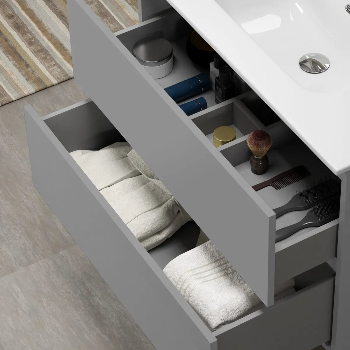 Kommoder och högskåp i serien är utrustade med mjukstängande mekanismer för lådor och dörrar, vilket både ökar användarkomforten och skyddar möblerna från onödigt slitage. Högskåpets dörrar är dessutom vändbara, vilket gör det möjligt att anpassa öppningsriktningen efter ditt badrums layout. Glashyllor i högskåpet ger en elegant och praktisk förvaringslösning, medan den handtagsfria designen skapar ett rent och modernt uttryck.