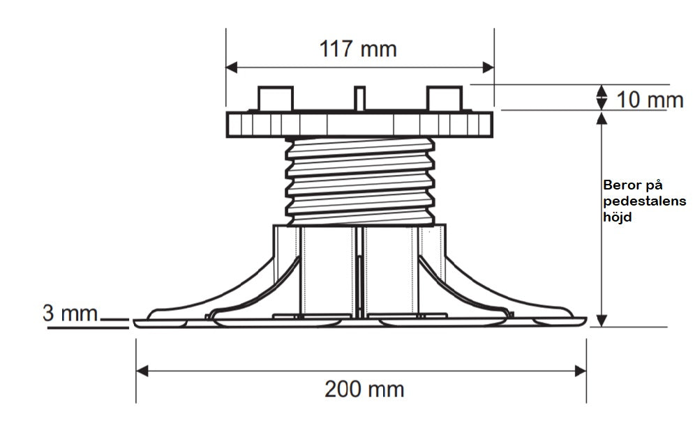 Piedestal Terrassfot 50-75mm är en piedestal eller fot som används primärt till ute-klinker för att få en upphöjd yta, och på så sätt kunna dölja ojämnt underlag, få bättre dränering och även kunna dra rör och dylikt under. Med mellanlägg av gummi. Justerbar höjd mellan 50-75 mm. Varje fot klarar en belastning på 1500 kg. Själva piedestalen mäter 200 mm i basen och den övre plattformen mäter 117 mm (med utstick). Se fler mått under bilder.