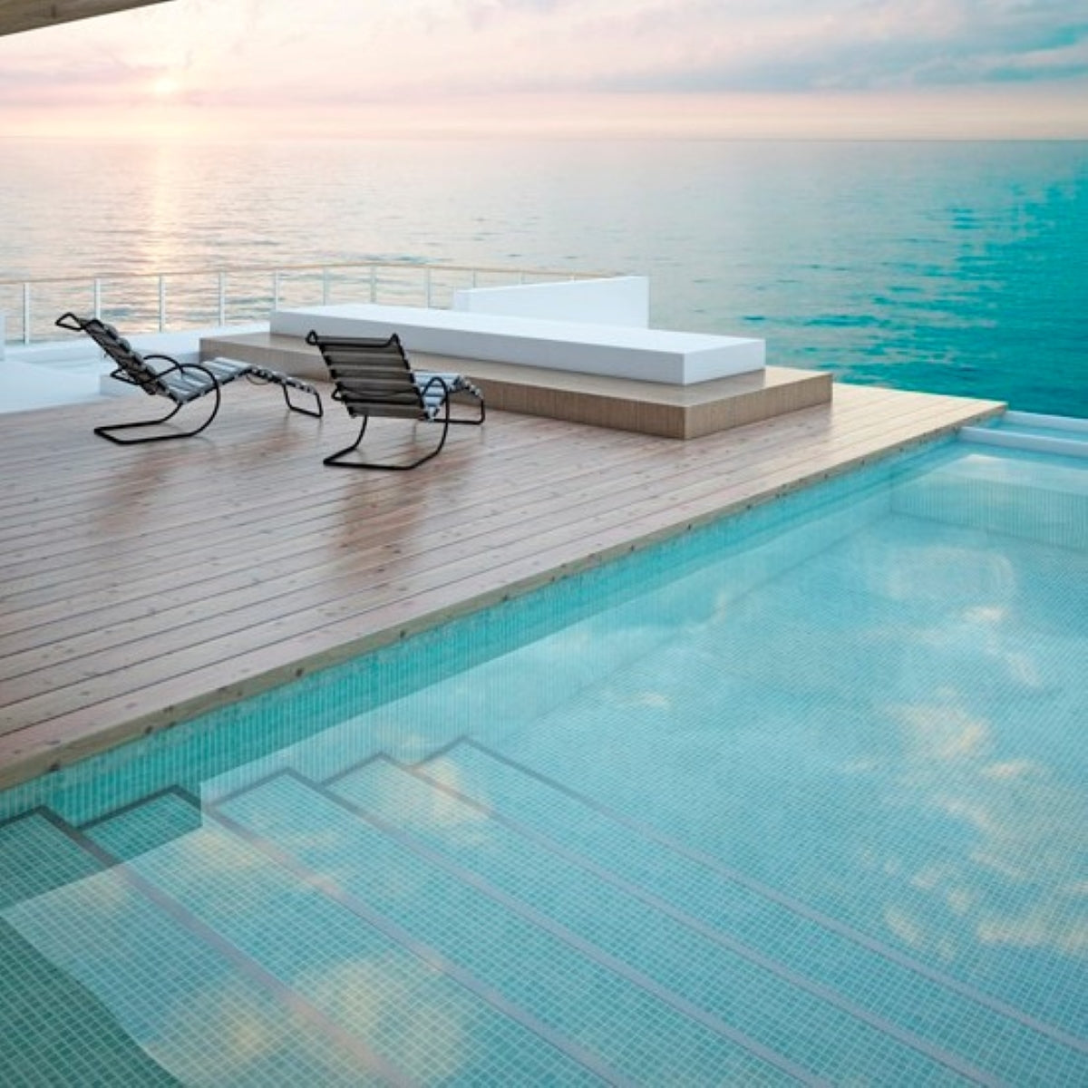 Poolmosaik är ett självklart val i pool och områden runt poolen, men kan också anändas i badrum, kök eller andra områden. Mosaiken är frostsäker och tål golvvärme.